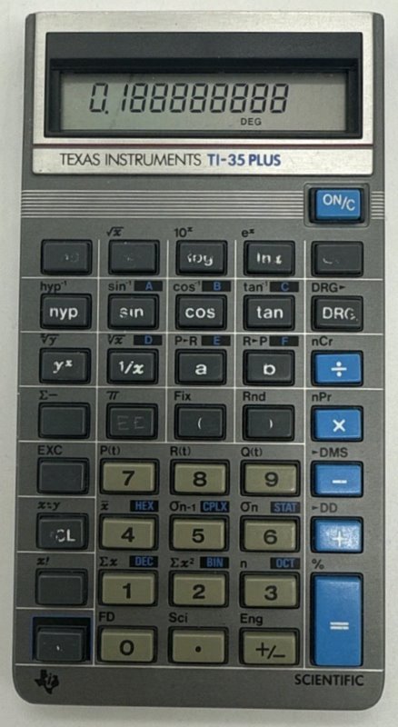 Info:From an advertisement of the time! The most ready. The TI-35 scientific calculator is more responsive because it has "constant" memory. To keep the contents unchanged, even when the calculator is turned off, restart the calculations in due course. AOS (algebraic operating system): 54 functions, algebraic, logarithmic, trigonometric and statistical, ultra-flat with very long life batteries, energy saving device!